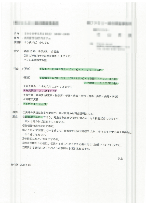 B社の調査料金の資料